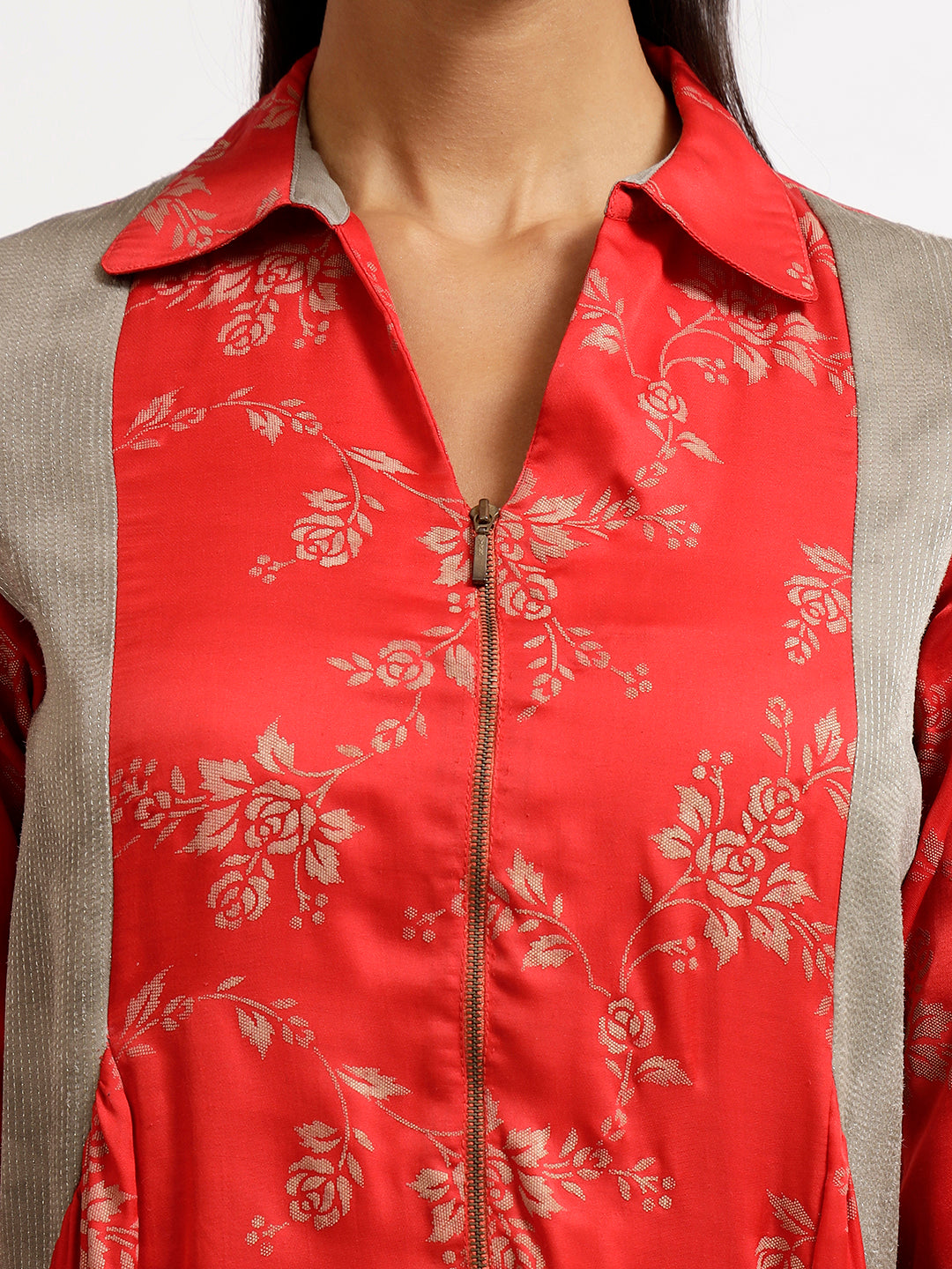 A red foil tunic featuring sleek grey panels on the sides, combining a vibrant metallic red finish with subtle grey accents for a modern, stylish look.